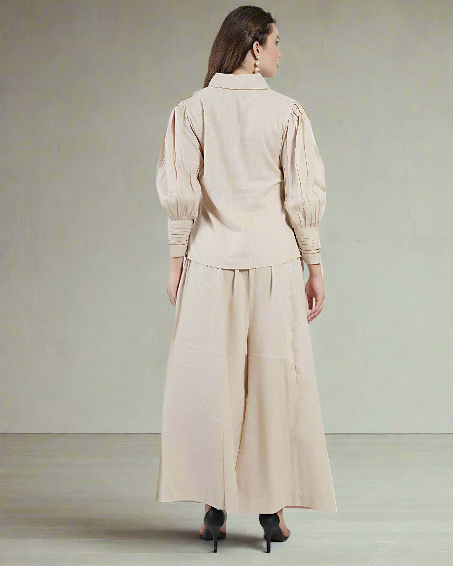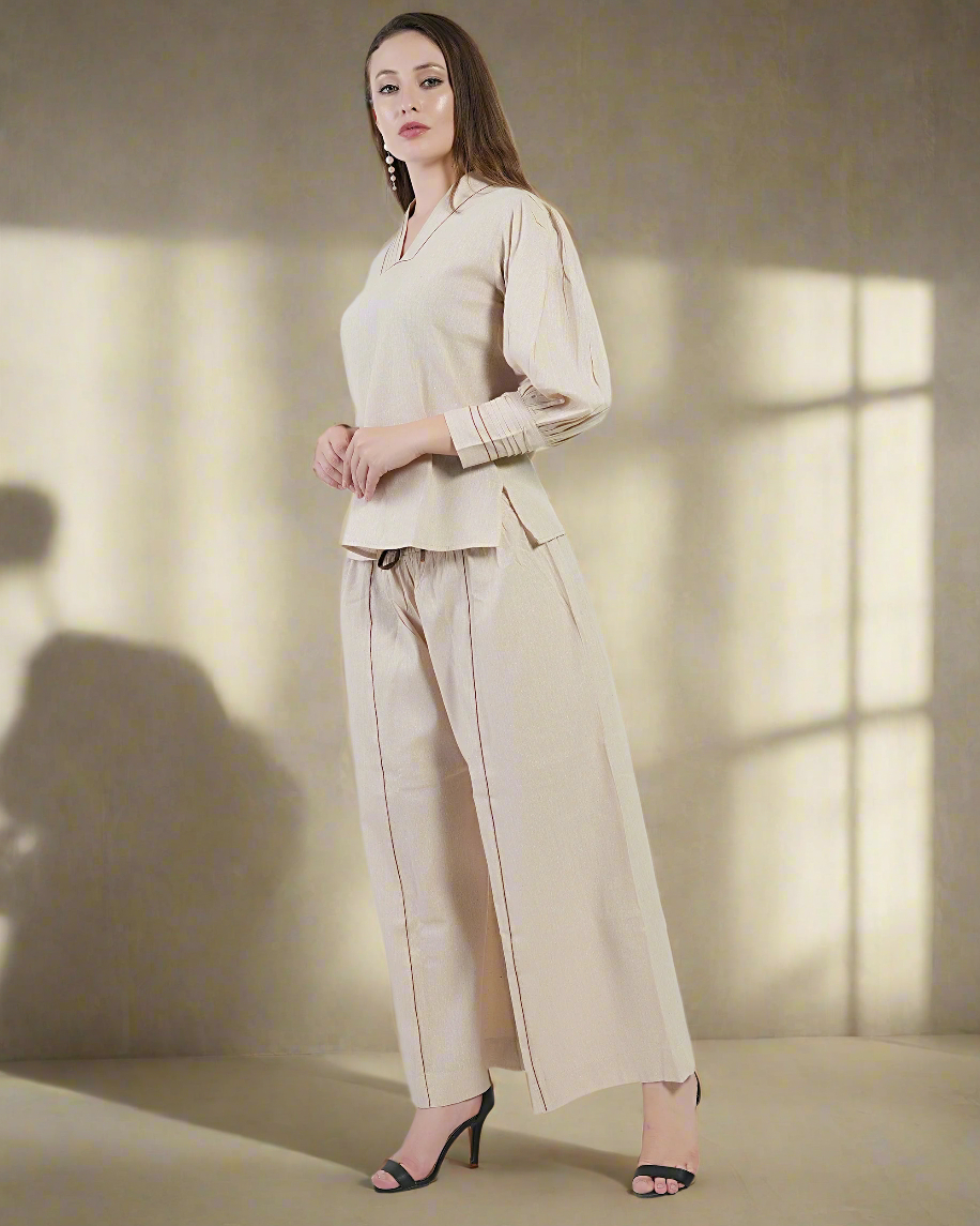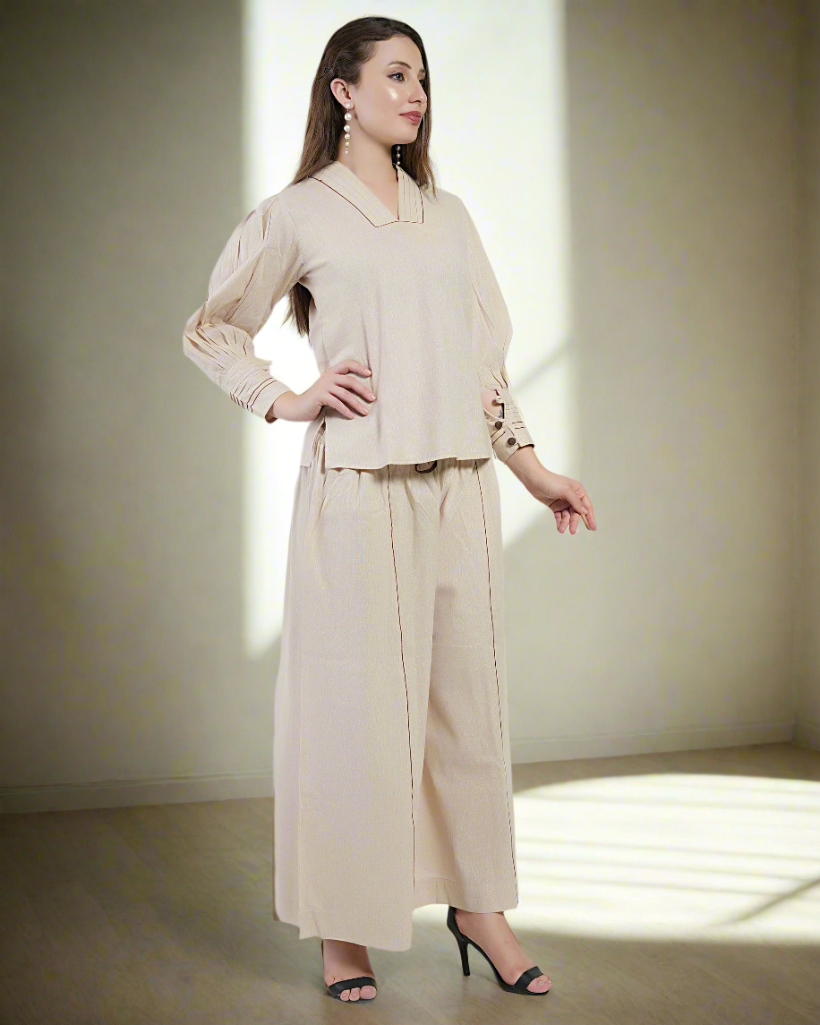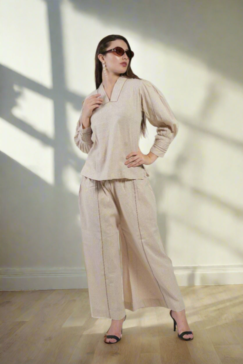 Beige V-Neck Gathered Cuff top & Wide-Leg pajama