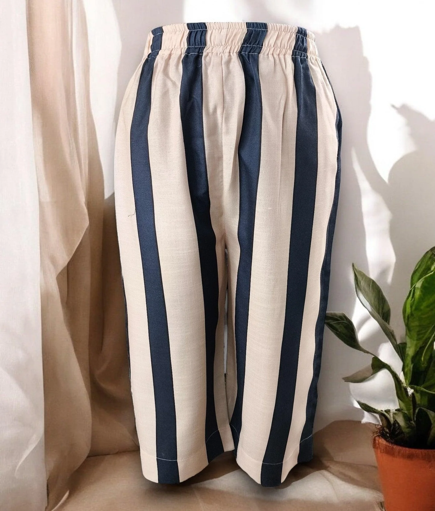 Complementing the top is a pair of striped bottoms that exude contemporary flair. The vertical stripes elongate the silhouette, while the elasticated waistband ensures maximum comfort without compromising on style.