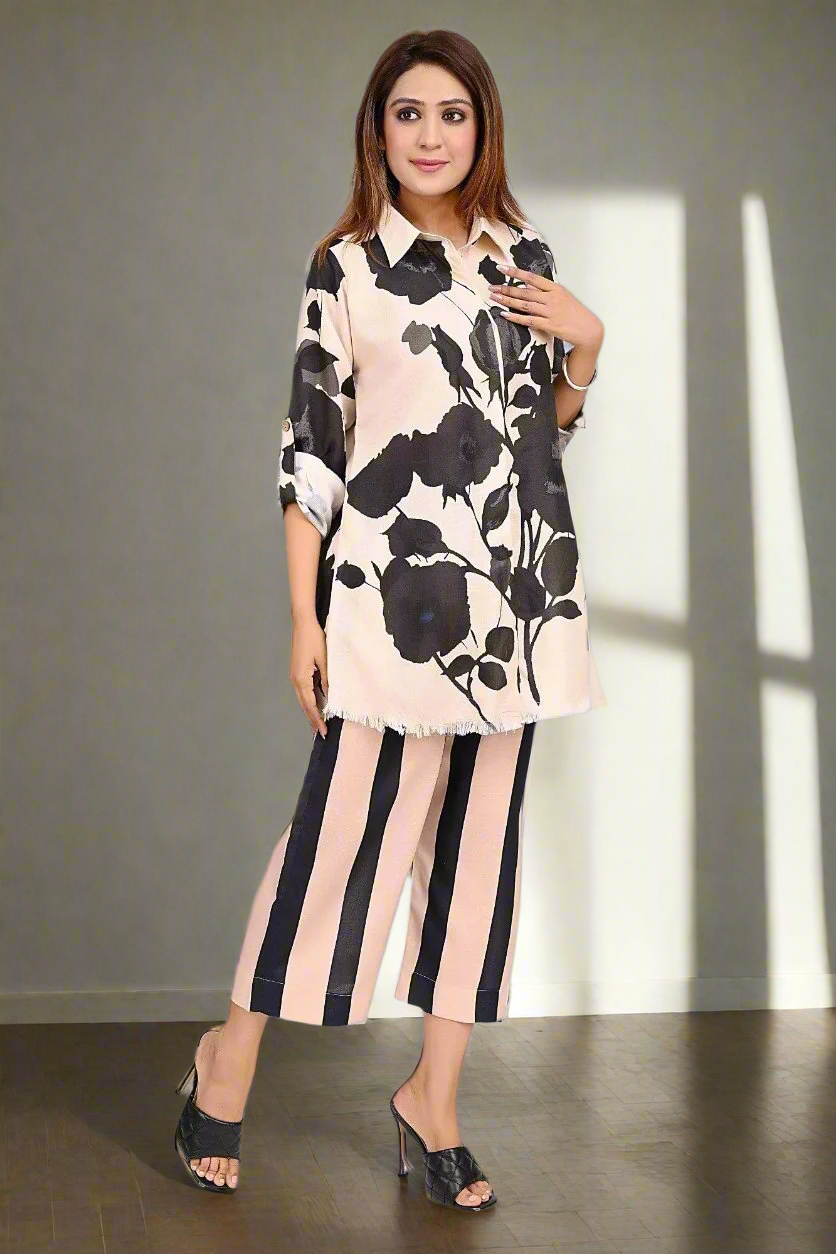 Floral digital Print Buttoned Placket shirt & Digital Printed Striped Bottoms Set